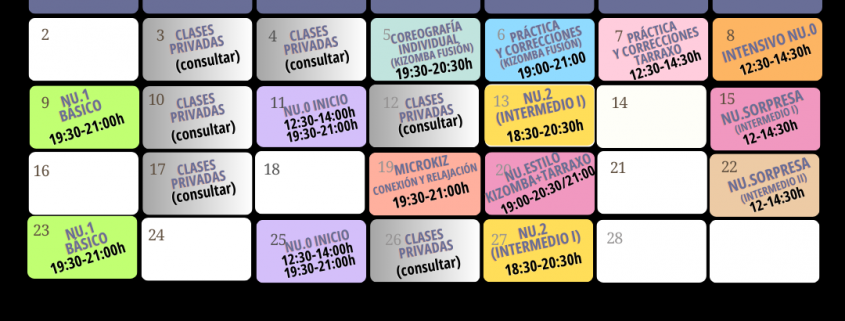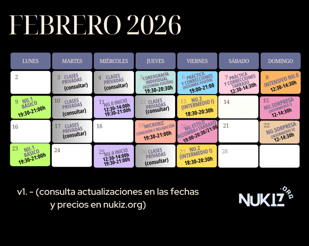 Continuamos el año con un mes lleno de actividades para todos los niveles de kizomba y nuevos huecos para clases particulares y privadas, para que aprendas a tu ritmo, solo o con quien quieras.